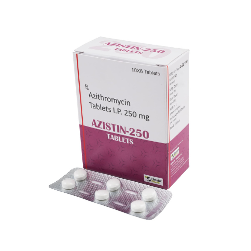 Azistin 250 mg (Azithromycin) is a macrolide antibiotic used to treat a variety of bacterial infections. It works by inhibiting bacterial protein synthesis, helping stop the growth of bacteria and allowing the body to fight the infection effectively. Azithromycin is commonly used for respiratory tract infections, throat infections, skin infections, and other bacterial conditions.